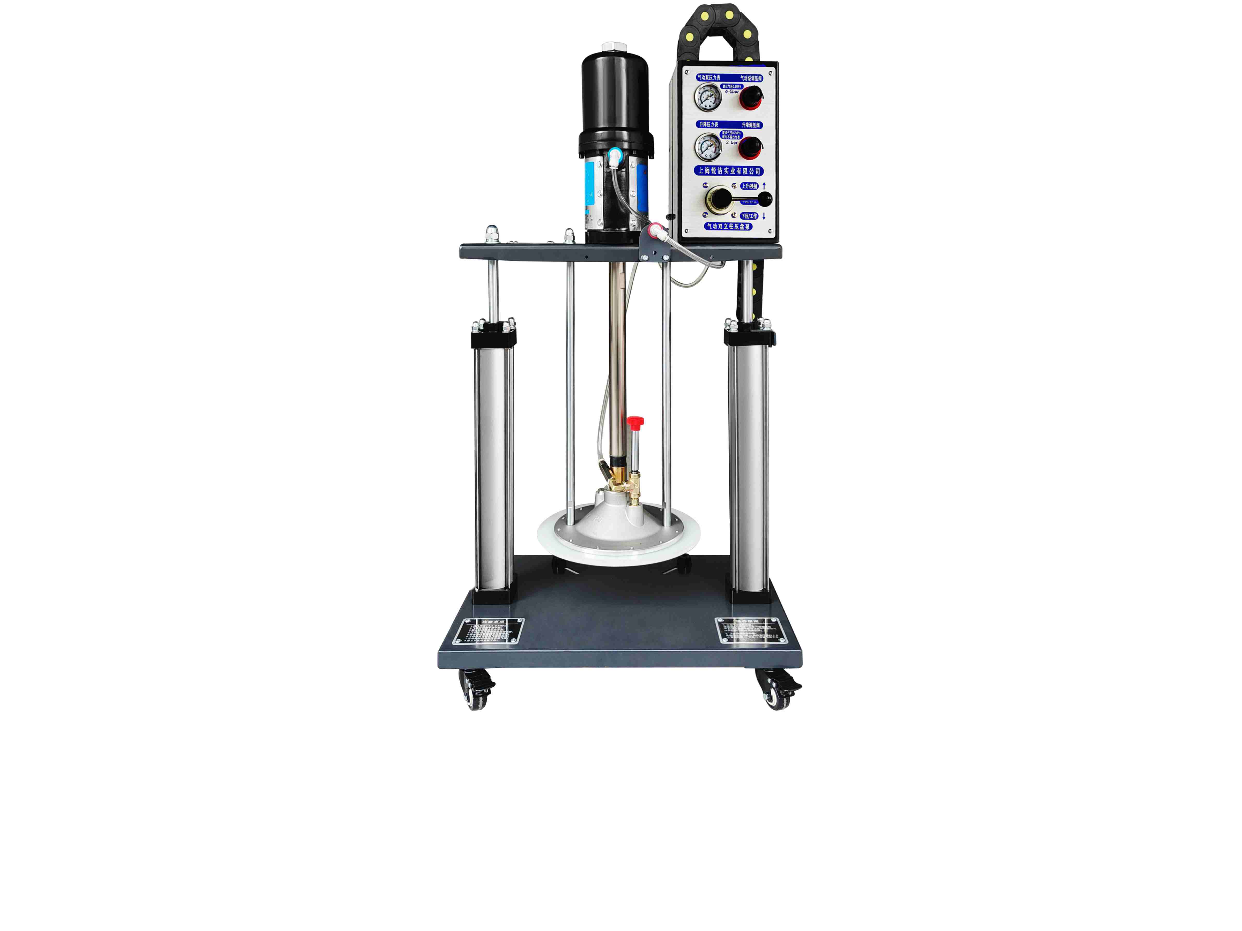 圖示為標準55加侖 170-220kg油脂桶用氣動雙立柱工業注脂機,配氣動工業油脂泵,帶出油排氣閥,有重型雙...